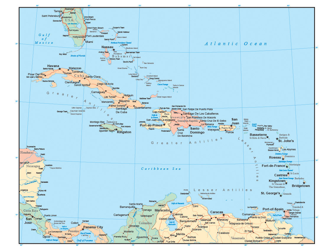 Caribbean Map with Countries, Cities, and Roads
